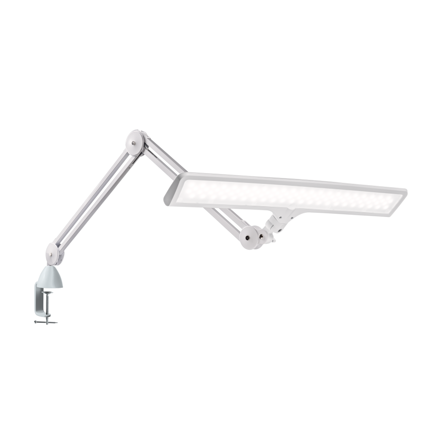 The Daylight Company's bright and powerful lamp with two brightness levels designed to give even light spread across wide areas. The large shade can be smoothly adjusted vertically, horizontally and laterally to reach the desired position. The durable arm with clamp fixes to a flat surface. With a long reach of 100cm, the Lumi is a professional workstation lamp that enables you to see fine details and true colours.